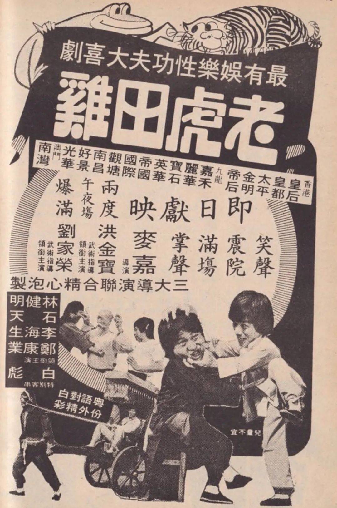 1978年7月21日上映的《老虎田鸡》,由洪金宝和麦嘉的嘉宝电影公司出品,洪金宝监制,麦嘉执导,曾志伟和麦嘉编剧,洪金宝和刘家荣担任武术指导,陈勋奇配乐;洪金宝、刘家荣、林建明、许莹英、钟发、黄哈、钱月笙、元彪、麦嘉、石天、徐忠信、火星、林正英、陈龙、陈会毅、孟海、小侯、冯克安、白彪、李海生等人主演。